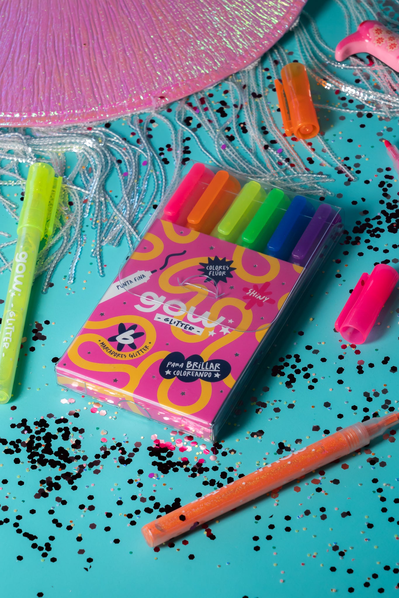 Este set tiene 6 marcadores de colores flúor con glitter que hacen que todo brille!